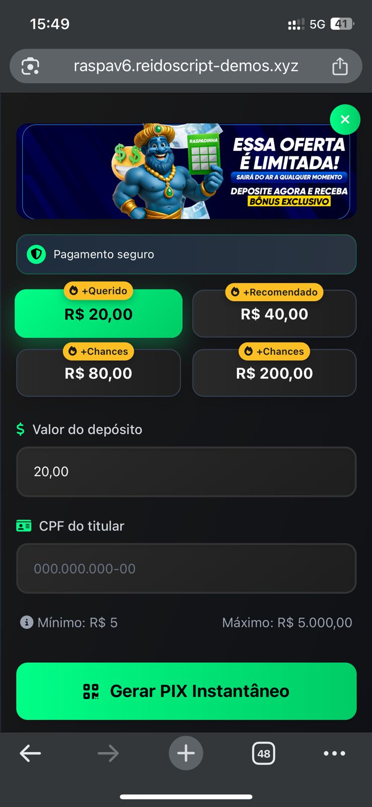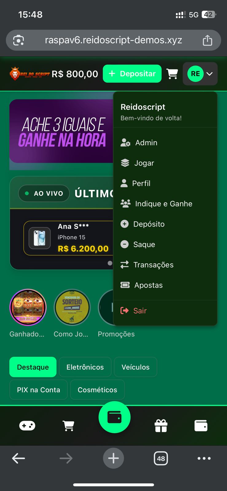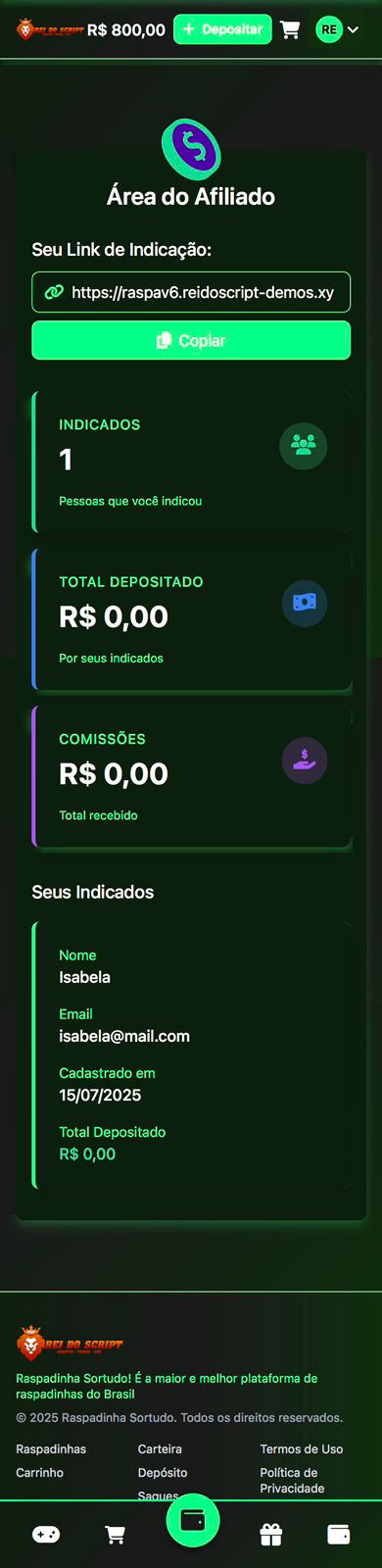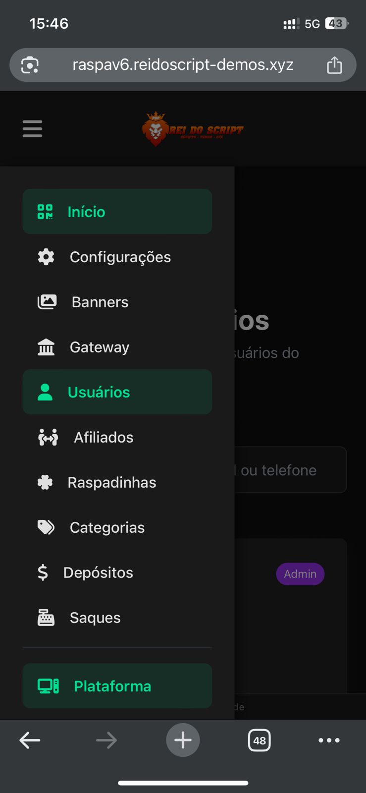 ✅ Gestão Completa: Controle de usuários, raspadinhas e finanças.